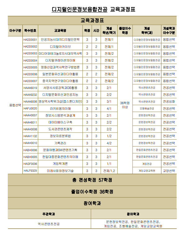 역사콘텐츠학과를 주관학과로, 문헌정보학과를 참여학과로 운영하며, 디지털인문학 개요, 역사학과 미디어 및 테크놀로지 사이의 관계, 역사학을 포함하는 인문학 전반의 연구교육과 디지털 콘텐츠화에 필요한 정보기술, 사회적 활용방안 등에 대한 교과목들 신설하여 운영하고, 동시에 학과별로 인문학과 디지털 정보기술의 융합에 필요한 전공 교과목들을 선별함으로써 선택과목으로 지정하여 운영한다. 최대한 학생들과 사회의 요청 그리고 학문적 필요성 모두가, 조화롭게 교육과정 개편 시에 반영될 수 있도록, 탄력적으로 운영할 계획이다.(신규 개설 가능한 18학점 중에 역사콘텐츠학과에서 12학점을 개설하였으며, 나머지 6학점은 문헌정보학과에서 추후 개설 예정)
